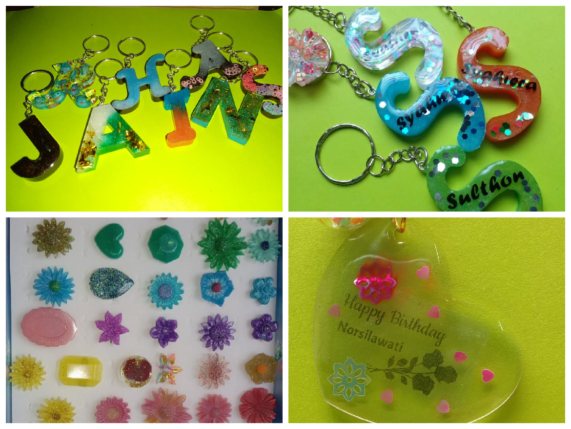 Jenis Perniagaan : Aneka Keychain Resin Pengusaha : Multazimah Binti Abu Bakar Lokasi : Felda Palong 4 Facebook : Cik-adik Mawar