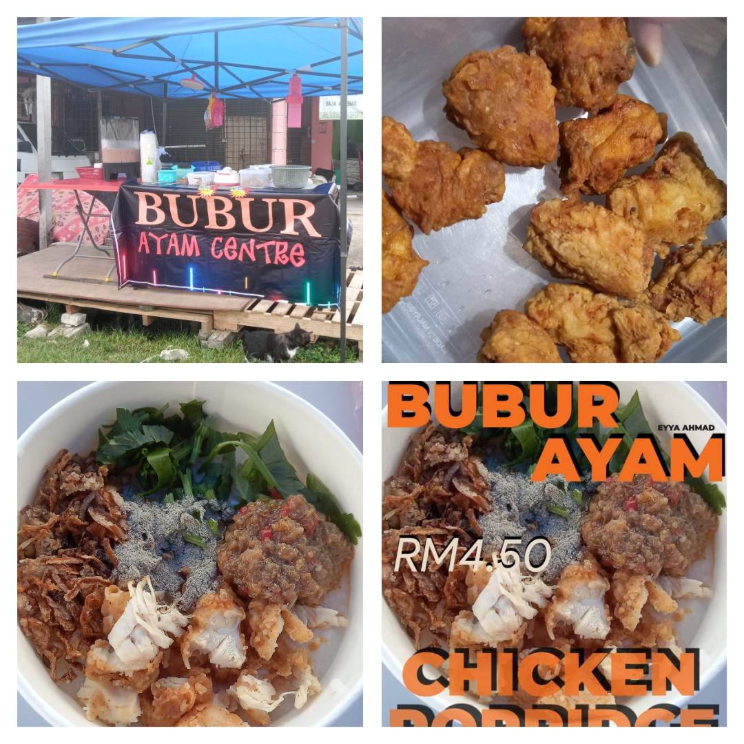 Jenis Perniagaan : Bubur Ayam Dan Kuih Muih Pengusaha : Eyya Ahmad Lokasi : Felda Palong 4,5,6 Facebook : Eyya Ahmad