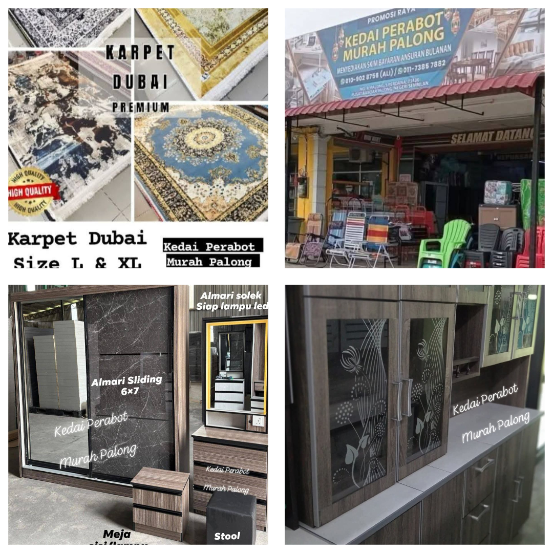 Jenis Perniagaan : Aneka Jenis Perabot Pengusaha : Fatimah Binti Ramly Lokasi : Pusat Bandar Palong 4,5,6. Facebook : Kedai Perabot Murah Palong