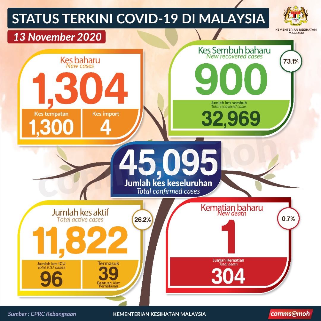 Status Terkini COVID-19 Di Malaysia, 13 Nov 2020 Kes sembuh=900 Jumlah kes sembuh=32,969 kes Kes baharu positif=1,304 (kes import=4, kes tempatan=1300) Jumlah positif=45,095 kes Kes kematian=1 Jumlah kes kematian=304 kes Kes dirawat di ICU=96 kes Bantuan Alat Pernafasan=39 kes […]