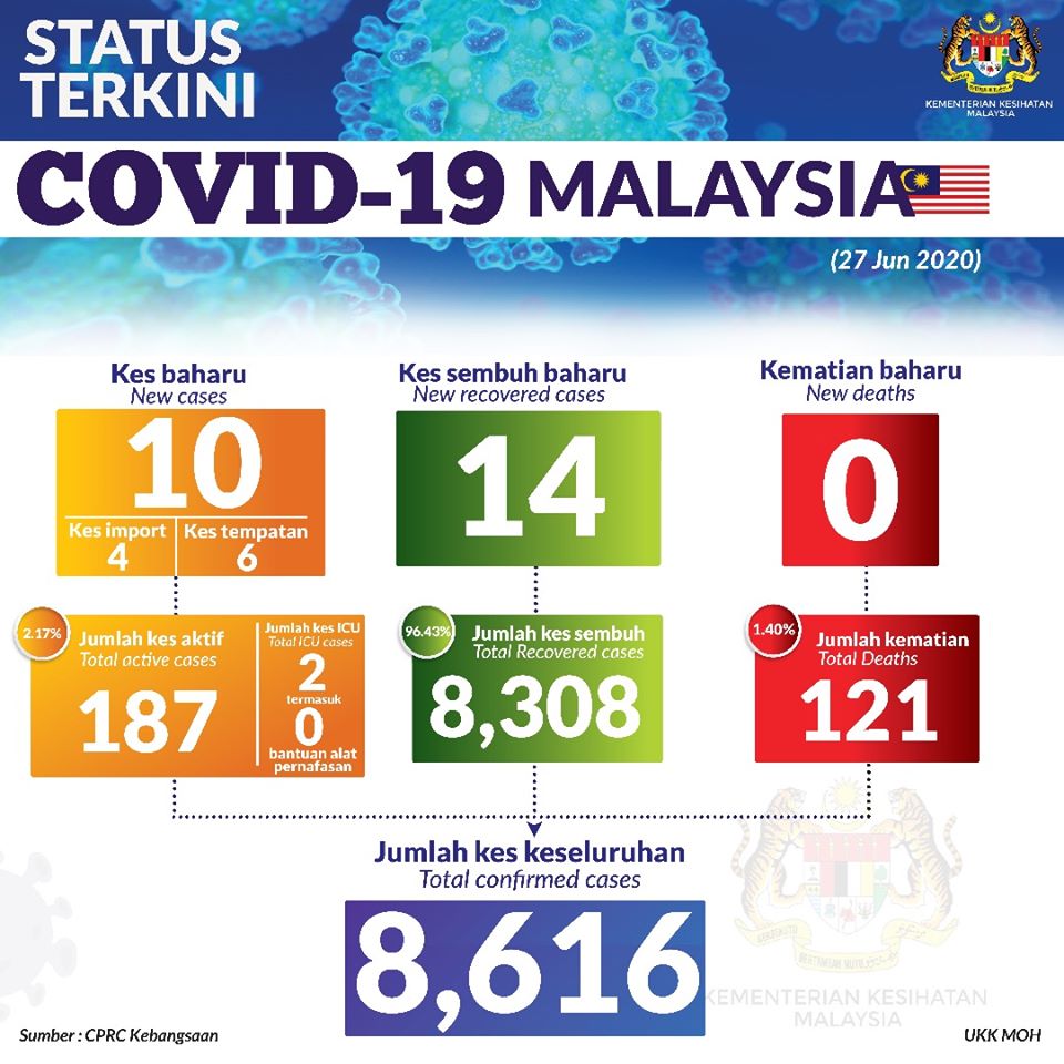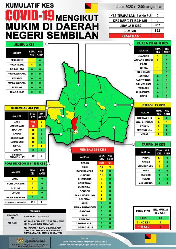 Sehingga 14 Jun 2020, jam 12.00 tengah hari, TIADA KES BARU positif COVID-19 dilaporkan ke Crisis Preparedness and Response Centre (CPRC) Jabatan Kesihatan Negeri, Negeri Sembilan, menjadikan jumlah keseluruhan kes COVID-19 kekal sebanyak 957 kes. Daripada jumlah tersebut, sebanyak 279 […]