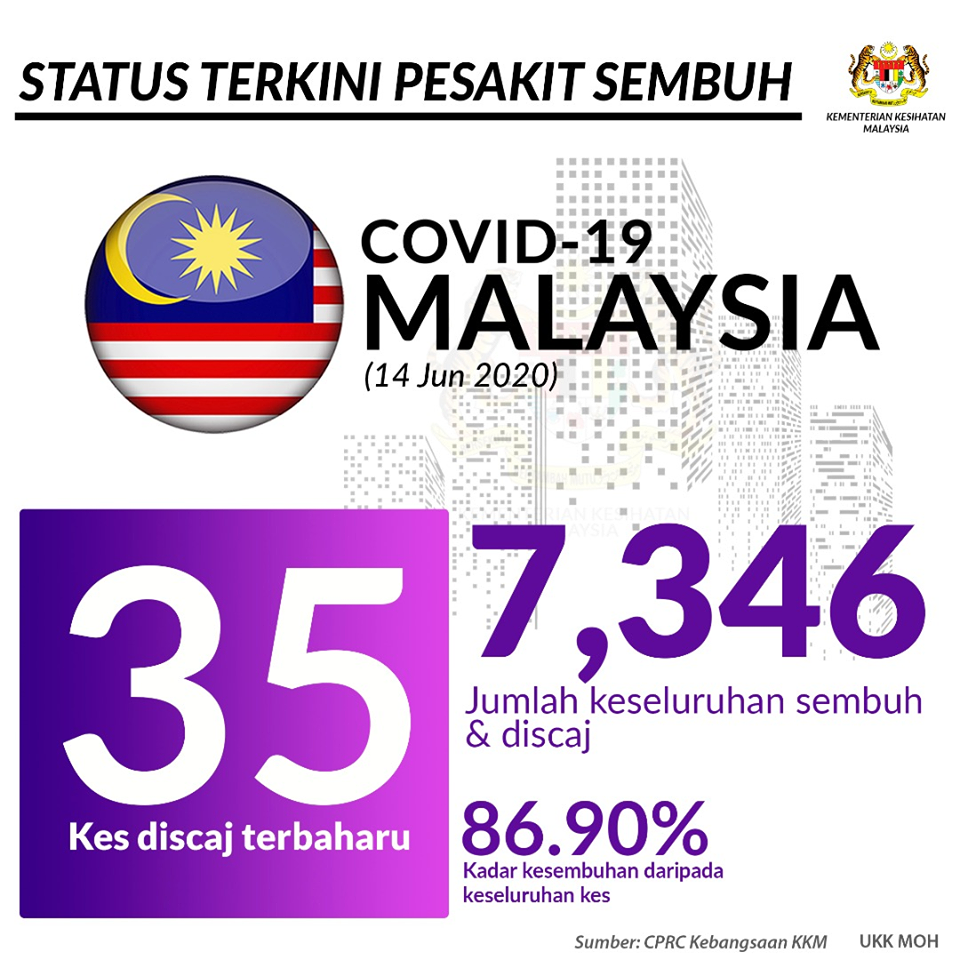Terkini Covid-19 STATUS KESEMBUHAN, 14 Jun 2020 35 kes sembuh dan telah discaj direkodkan pada hari ini menjadikan jumlah keseluruhan sembuh adalah sebanyak 7,346. #covid19#dudukrumah#stayathome#mcmc#pusatinternet