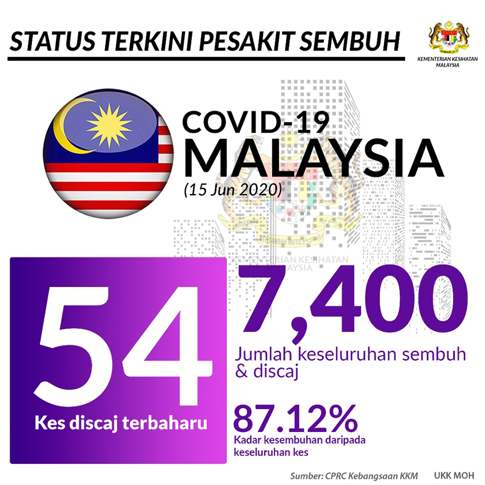 Terkini Covid-19, STATUS KESEMBUHAN, 15 Jun 2020 54 kes sembuh dan telah discaj direkodkan pada hari ini menjadikan jumlah keseluruhan sembuh adalah sebanyak 7,400 kes. #covid19#dudukrumah#stayathome#mcmc#pusatinternet