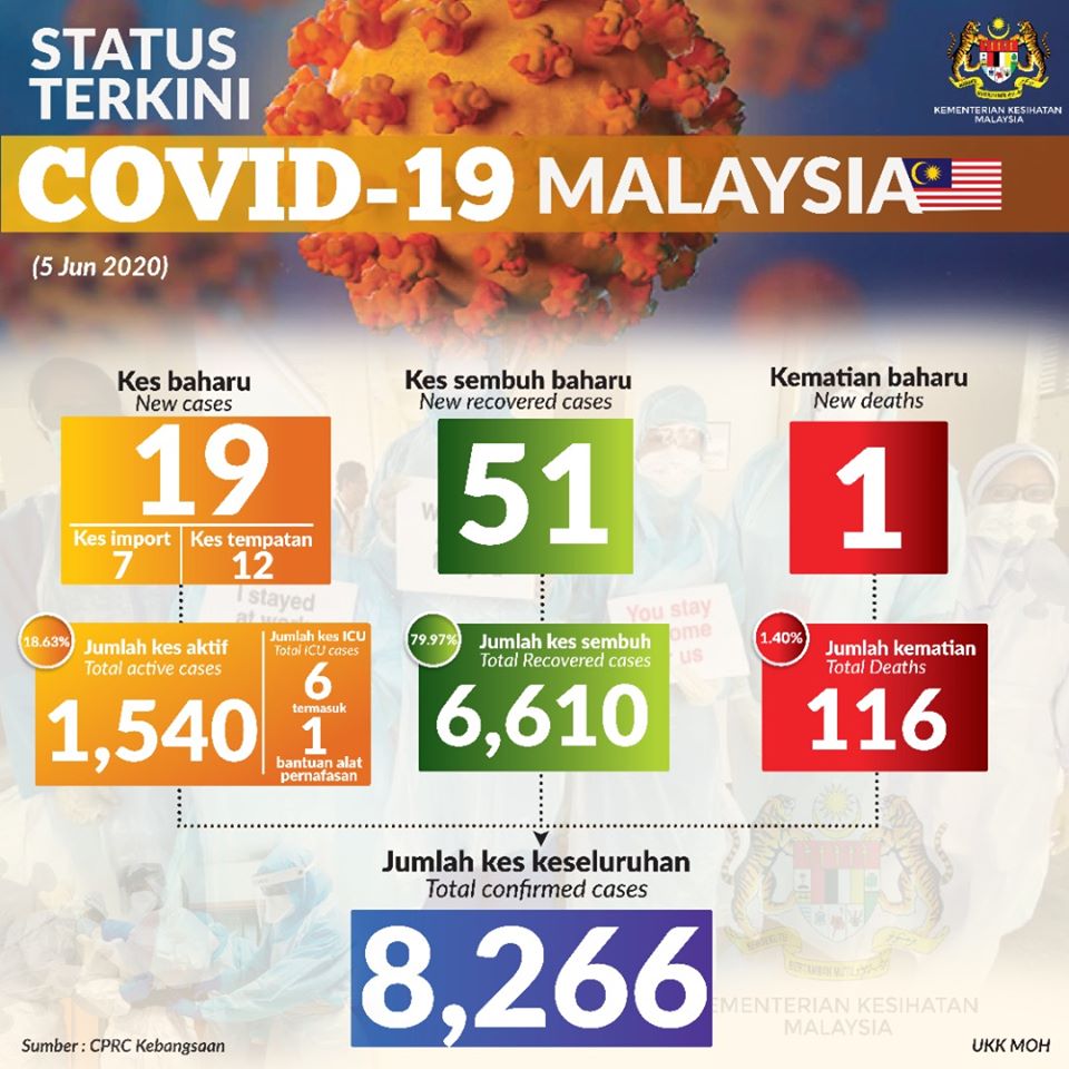 Terkini Covid-19,Status Covid-19 pada 05 Jun 2020 Sebanyak 19 kes baharu telah dilaporkan, di mana 7 daripadanya adalah kes import dan 12 kes adalah penularan tempatan. Daripada jumlah kes penularan tempatan ini, 3 kes adalah adalah bukan warganegara dan 9 […]