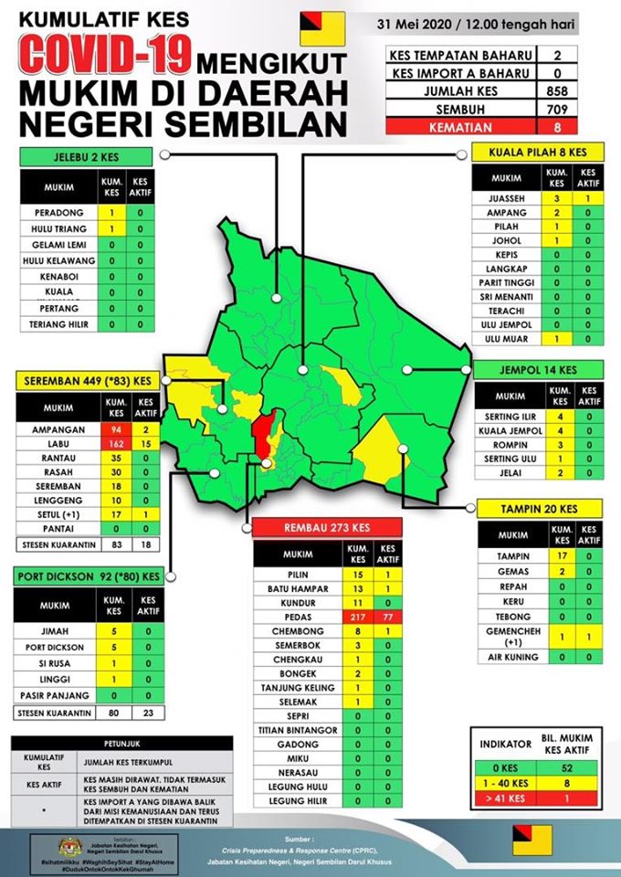 Sehingga 31 Mei 2020, jam 12.00 tengah hari, terdapat DUA (2) KES BARU positif COVID-19 dilaporkan ke Crisis Preparedness and Response Centre (CPRC) Jabatan Kesihatan Negeri, Negeri Sembilan, menjadikan jumlah keseluruhan kes COVID-19 sebanyak 858 kes. Daripada jumlah tersebut, sebanyak […]