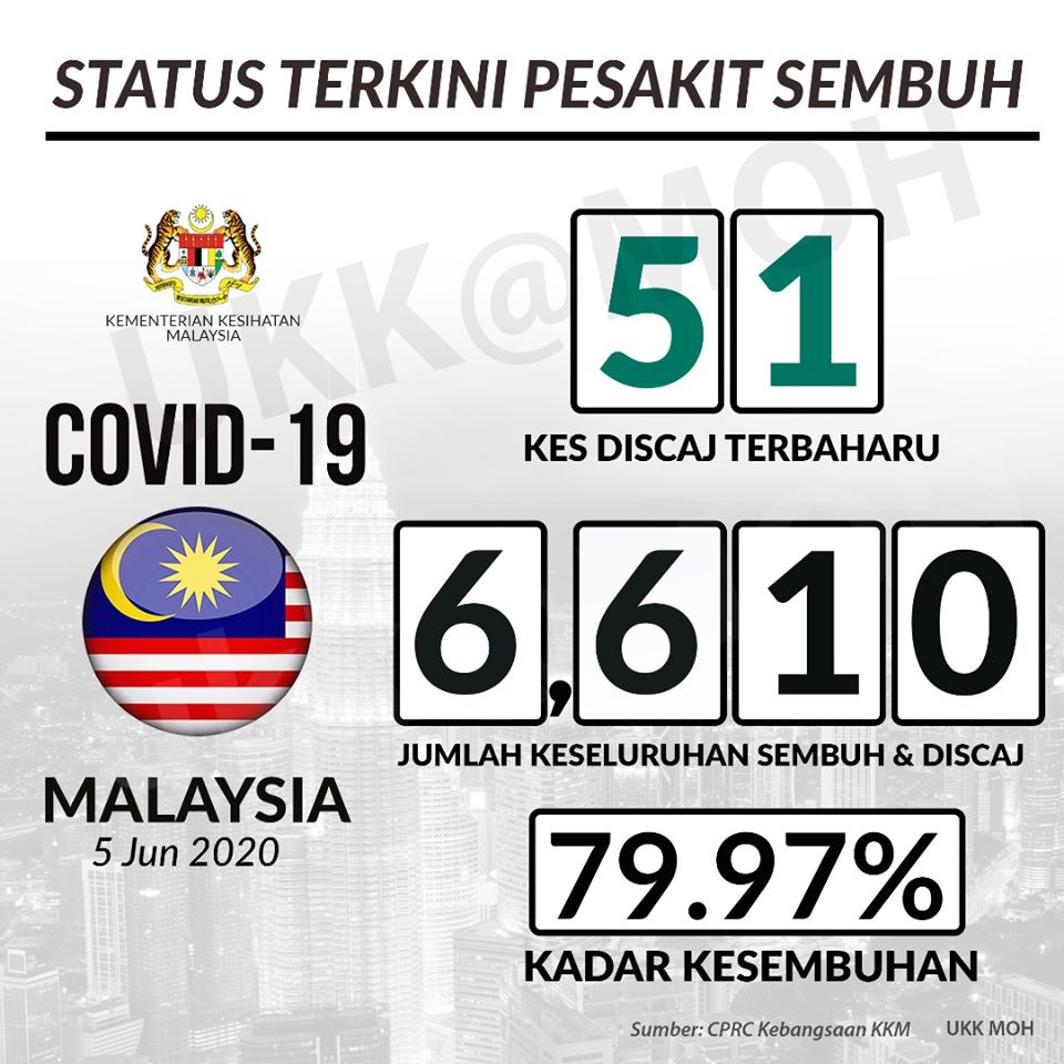 Terkini Covid-19, 05 Jun 2020 51 kes sembuh dan telah discaj direkodkan pada hari ini menjadikan jumlah keseluruhan sembuh adalah sebanyak 6,610 kes (79.97%) Tahniah kepada anggota KKM dan pihak yang bekerjasama mengekang penularan Covid-19.Terima kasih atas pengorbanan anda. #covid19#dudukrumah#stayathome#mcmc#pusatinternet