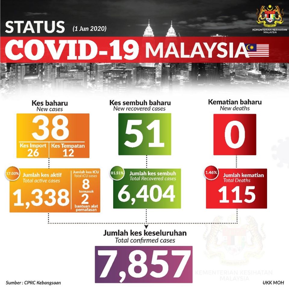 Terkini Covid-19, 1 Jun 2020Kes sembuh = 51Jumlah kes sembuh = 6,404Kes baharu positif = 38Jumlah positif = 7,857Kes kematian = 0Jumlah Kes kematian = 115Sebanyak 8 kes dirawat di ICU dan 2 daripadanya memerlukan bantuan alat pernafasan. #COVID19#SKMM#PusatInternet#PiNegeriSembilan#PiKlusterJempol#stayAtHome#staySafe