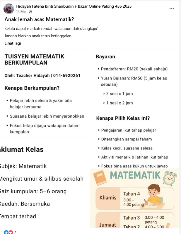 Jenis Perniagaan : Tuisyen Aneka Subjek Sekolah Rendah Pengusaha : Hidayah Fateha Lokasi : Pusat Bandar Palong 4,5,6. Facebook : Hidayah Fateha Binti Sharibudin