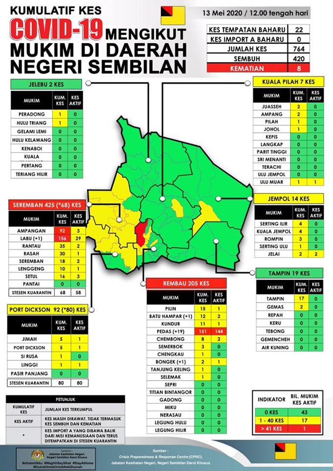 Sehingga 13 Mei 2020 jam 12.00 tengah hari, terdapat 22 KES BARU positif COVID-19 dilaporkan ke Crisis Preparedness and Response Centre (CPRC) Jabatan Kesihatan Negeri, Negeri Sembilan, menjadikan jumlah keseluruhan kes COVID-19 adalah sebanyak 764 KES. Daripada jumlah keseluruhan, sebanyak […]
