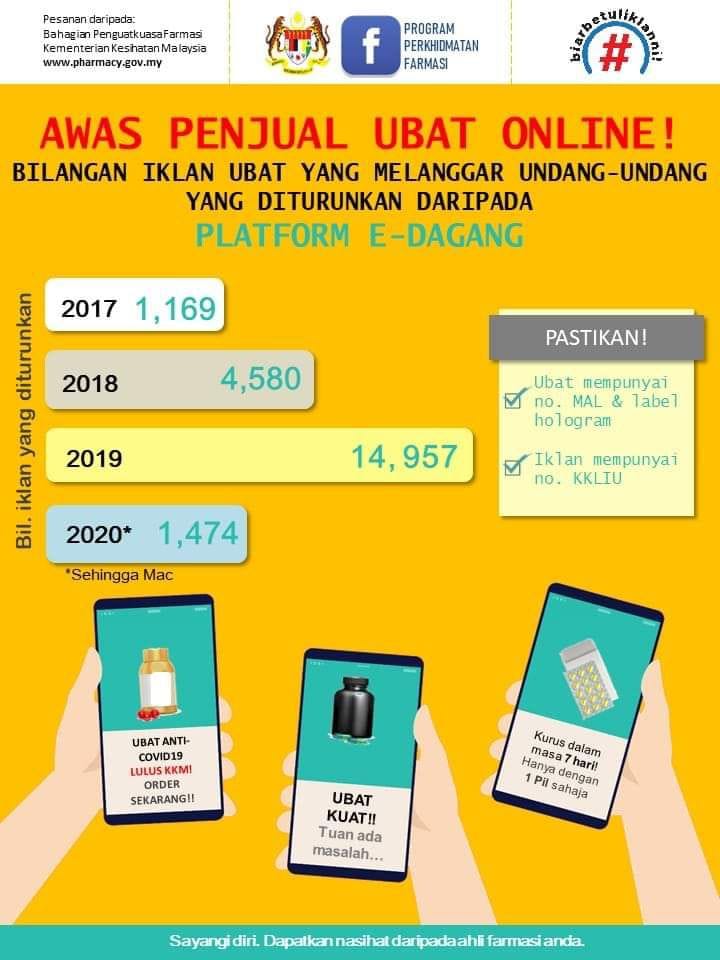 Kementerian Kesihatan Malaysia sentiasa memantau iklan dan penjualan ubat secara online. Berikut merupakan statistik iklan ubat yang diturunkan daripada platform e-Dagang. Iklan-iklan tersebut melanggar Akta Ubat (Iklan & Penjualan) 1956, Akta Racun 1952, Akta Jualan Dadah 1952 dan Peraturan-peraturan Kawalan […]