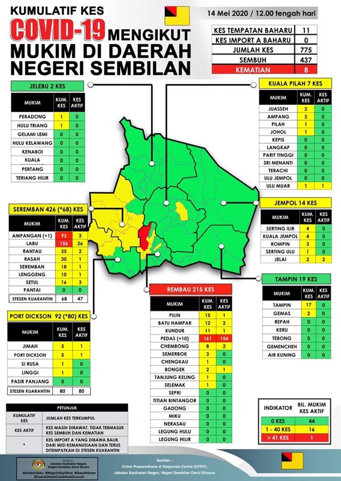 Sehingga 14 Mei 2020 jam 12.00 tengah hari, terdapat 11 KES BARU positif COVID-19 dilaporkan ke Crisis Preparedness and Response Centre (CPRC) Jabatan Kesihatan Negeri, Negeri Sembilan, menjadikan jumlah keseluruhan kes COVID-19 adalah sebanyak 775 KES. Daripada jumlah keseluruhan, sebanyak […]
