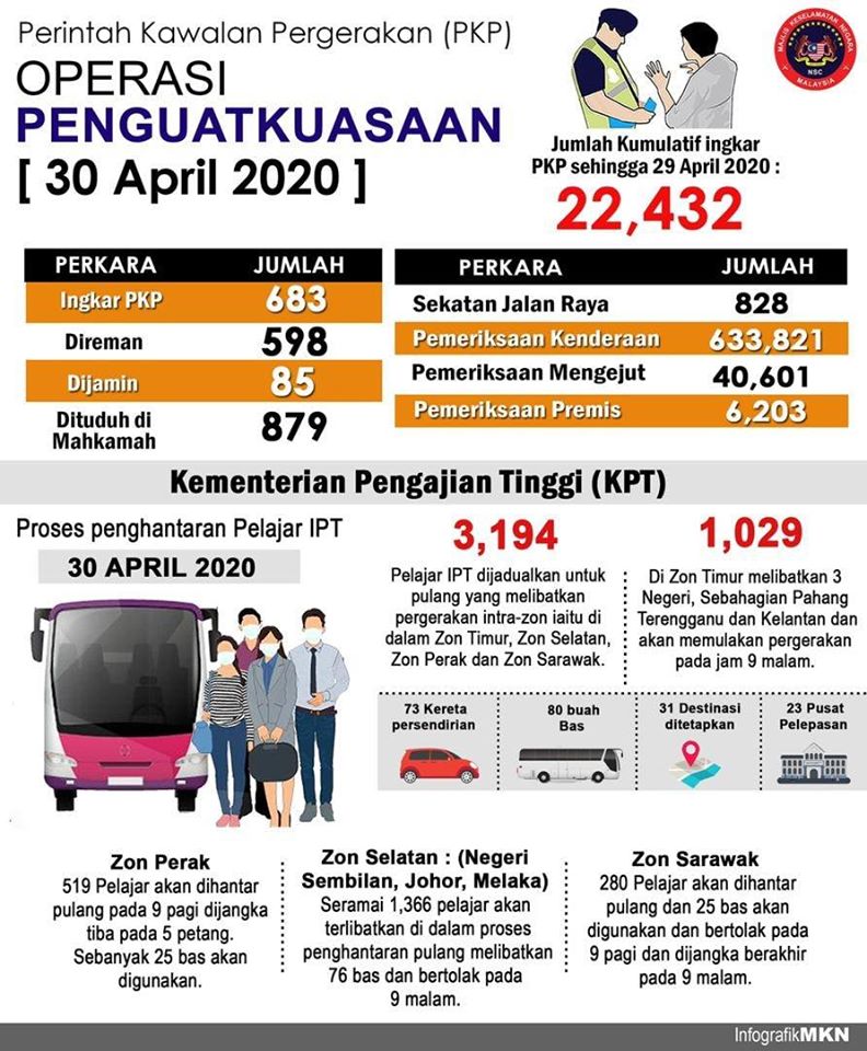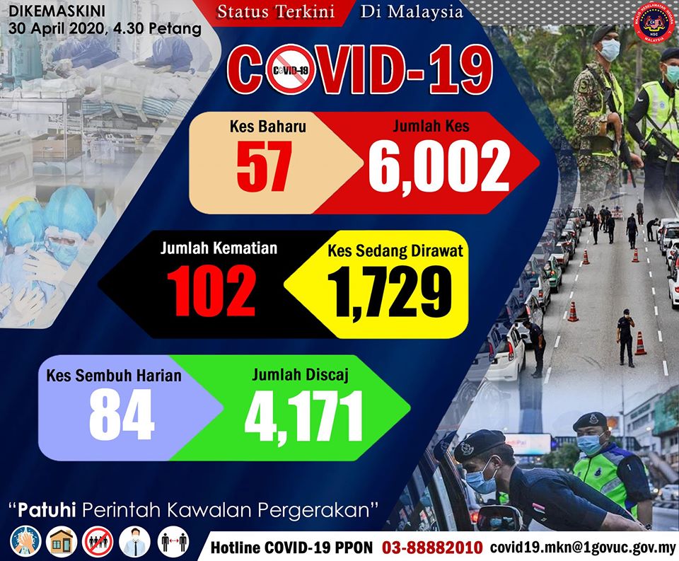 Situasi terkini 30 April 2020 #COVID19 di Malaysia : Sebanyak 57 kes baru menjadikan jumlah keseluruhan 6,002 kes. 84 kes telah pulih menjadikan 4,171 pesakit telah pulih dan discaj. 2 kematian dicatatkan menjadikan jumlah keseluruhan kematian sebanyak 102 kes. Jangan risikokan diri […]