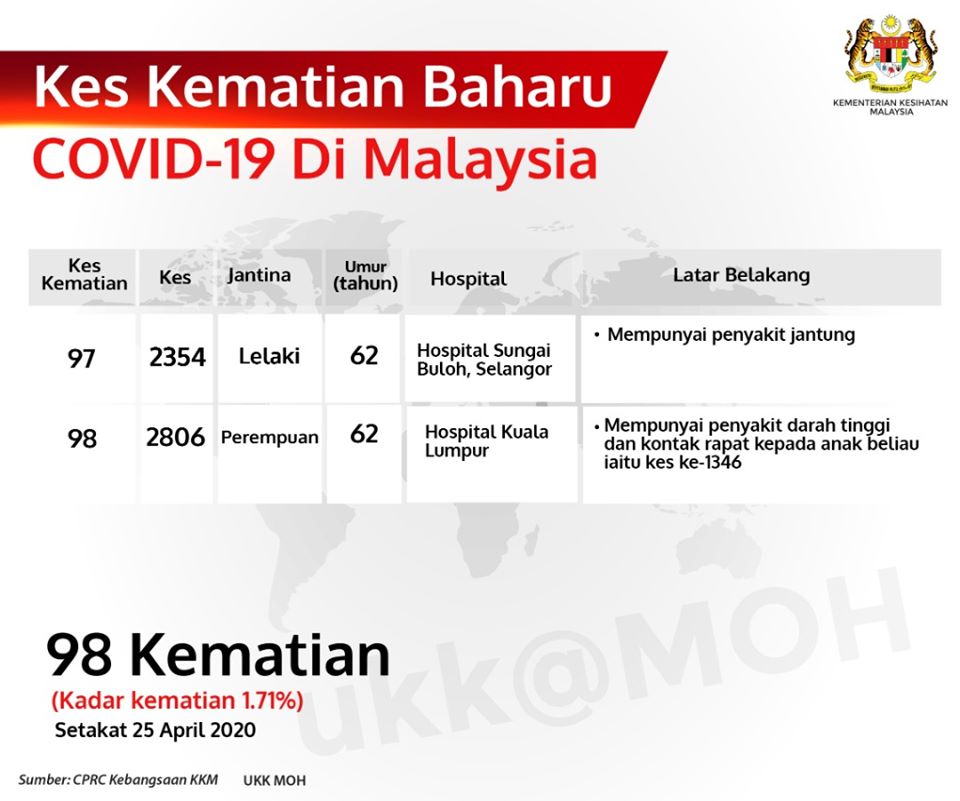 Kes Kematian Baharu #COVID19Malaysia setakat 4 Petang, 25 April 2020 adalah seramai 2 orang.Ini menjadikan jumlah kes kematian setakat ini adalah seramai 98 orang. #COVID19#SKMM#PusatInternet#PiNegeriSembilan#PiKlusterJempol#stayAtHome#staySafe