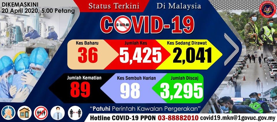 Situasi terkini 20 April 2020 #COVID19 di Malaysia : Sebanyak 36 kes baru menjadikan jumlah keseluruhan 5,425 kes. 98 kes telah pulih menjadikan 3,295 pesakit telah pulih dan discaj. Tiada kematian dicatatkan menjadikan jumlah keseluruhan kematian sebanyak 89 kes. Jangan risikokan diri […]