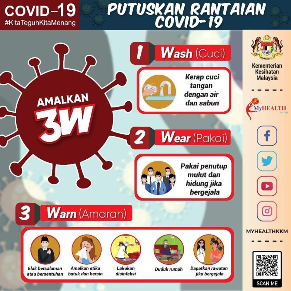 Amalkan 3W bagi memutuskan rantaian COVID-19. 1️⃣ ?ash : Kerap cuci tangan dengan air dan sabun2️⃣ ?ear : pakai penutup mulut dan hidung jika bergejala3️⃣ ?arn : Amalkan perkara seperti tidak bersalaman, etika batuk dan bersin yang betul dan duduk rumah. #COVID19#SKMM#PusatInternet#PiNegeriSembilan#PiKlusterJempol#stayAtHome#staySafe