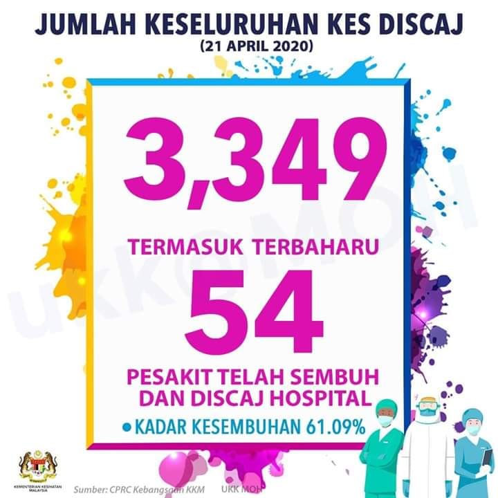TERKINI #COVID19Malaysia, 21 April 2020.Bilangan kes pesakit sembuh dan telah discaj hospital adalah sebanyak 54 kesJumlah keseluruhan kes telah sembuh dan discaj adalah 3,349 kes bersamaan dengan 61.09% kadar kesembuhan dari jumlah keseluruhan kes positif. #COVID19#SKMM#PusatInternet#PiNegeriSembilan#PiKlusterJempol#stayAtHome#staySafe