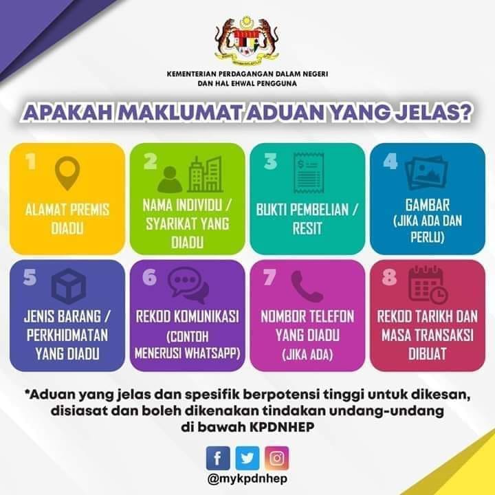 Maklumat aduan yang jelas diperlukan sekiranya anda ingin membuat aduan salah laku peniaga/individu yang melanggar undang-undang yang ditetapkan oleh pihak KPDNHEP. #COVID19#SKMM#PusatInternet#PiNegeriSembilan#PiKlusterJempol#stayAtHome#staySafe