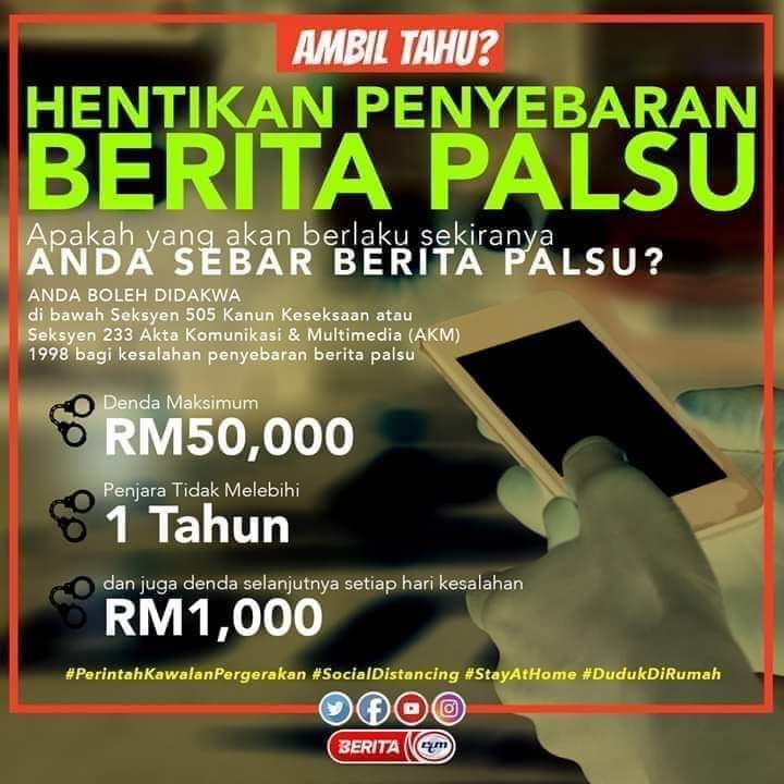 [Infografik] Hentikan Penyebaran Berita Palsu. Perintah Kawalan Pergerakan. Apakah yang akan berlaku sekiranya anda sebar berita palsu? Anda boleh didakwa dibawah Seksyen 505 Kanun Keseksaan atau Seksyen 233 Akta Komunikasi & Multimedia (AKM) 1998 bagi kesalahan penyebaran berita palsu. Denda […]