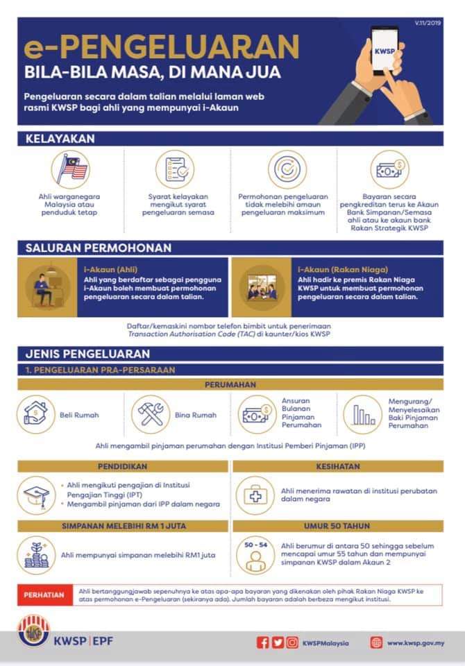 Sila layari https://www.kwsp.gov.my/documents/20126/131635/Risalah_ePengeluaran_01012019.pdf/248e8c05-151d-f67d-4754-9c2ae1bc9795 untuk maklumat lanjut berkenaan e-pengeluaran.
